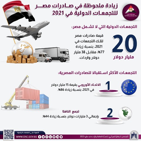 "زيادة ملحوظة في صادرات مصر للتجمعات الدولية في 2021"... إنفوجرافيك جديد نشره مركز معلومات مجلس الوزراء المصري