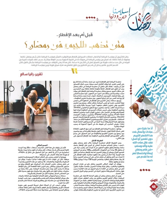 وعن الطريقة الأمثل لممارسة الرياضة خلال شهر رمضان يقول «أحمد»: يمكن للصائم ممارسة المشى أو الجرى قبل الإفطار بنصف ساعة، وبعدها يتناول فطوره المكون من 3 ثمرات تمر، وشرب مياه على أن يتناول 50 جرامًا من النشويات كالبطاطس و100 جرام من البروتين كصدور الفراخ، ويمكن أن يؤجل التمرين لما بعد الإفطار بساعة من تناول هذه الوجبة. وإذا اختار أن يتمرن بعد فطوره مباشرة، فعليه الإفطار على 3 ثمرات من التمر وتناول أى مكمل غذائى على أن يستمر التمرين ساعة إلا ربعا، بعدها يتناول إفطاره، وتتضمن الوجبة 150 جرامًا بروتين و100 جرام أرز وطبق سلطة.