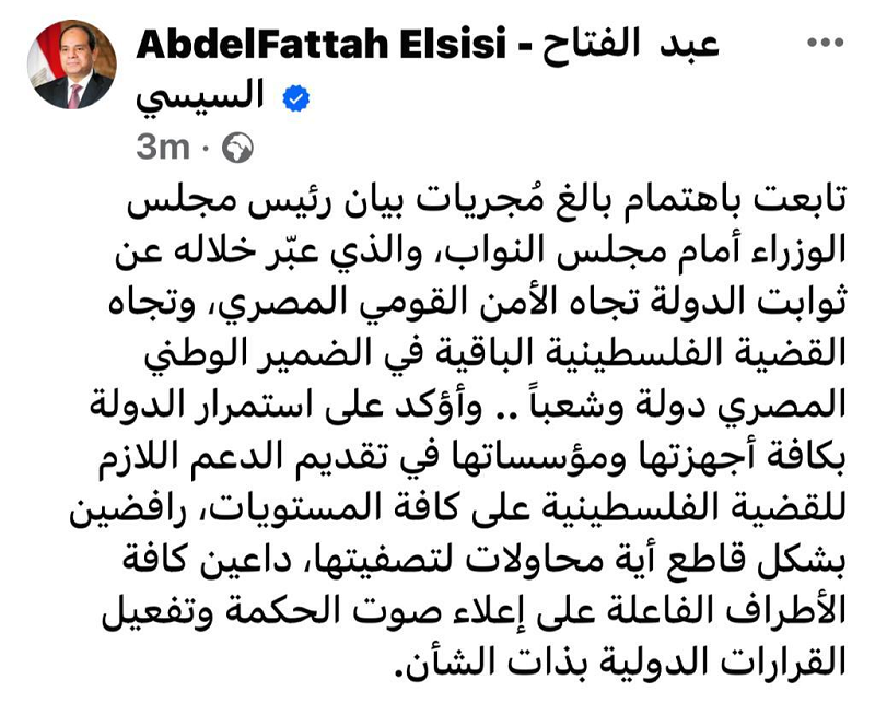 وأكد، الرئيس السيسي فى تدوينة على حسابه الرسمى على موقع التواصل الاجتماعى "فيسبوك"، استمرار الدولة بكافة أجهزتها ومؤسساتها في تقديم الدعم اللازم للقضية الفلسطينية على كافة المستويات، رافضين بشكل قاطع أية محاولات لتصفيتها، داعين كافة الأطراف الفاعلة على إعلاء صوت الحكمة وتفعيل القرارات الدولية بذات الشأن.