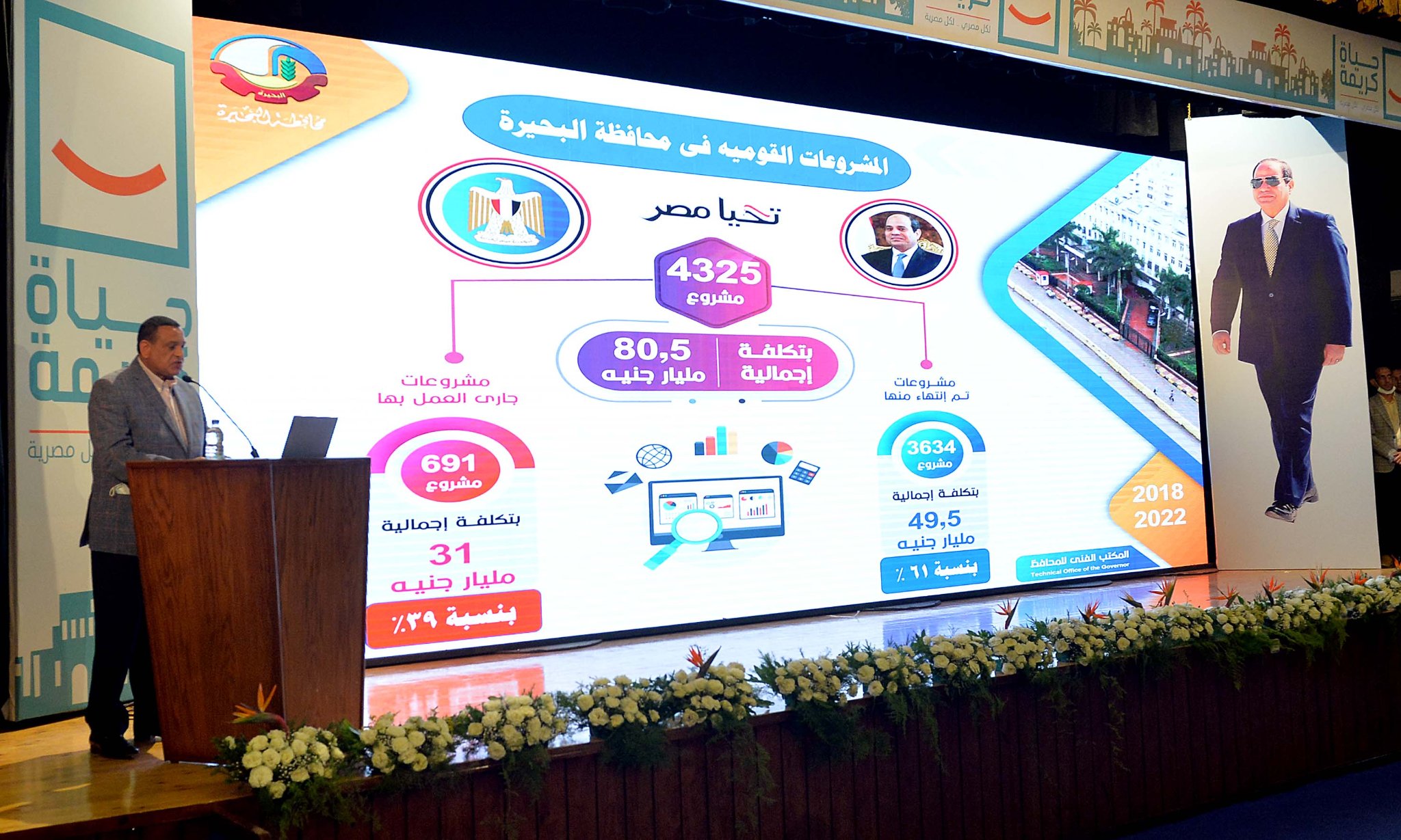 وقدم محافظ البحيرة عرضاً حول أهم المشروعات القومية، التي بدأ العمل في تنفيذها بالمحافظة منذ ٢٠١٨ حتى الآن والتي بلغ عددها 4325 مشروعاً، بتكلفة إجمالية بلغت قيمتها 80.5 مليار جنيه، مشيراً إلى أنه تم الانتهاء من 3٦٣4 مشروعاً بتكلفة إجمالية بلغت 49.5 مليار جنيه، بنسبة تنفيذ تصل إلى 61%، وجار العمل بـ 691 مشروعاً بتكلفة إجمالية بلغت 31 مليار جنيه، بنسبة تنفيذ 39% بالقطاعات المختلفة، فضلاً عن مشروعات المبادرة الرئاسية "حياة كريمة" التي يتكلف تنفيذها 44 مليار جنيه.